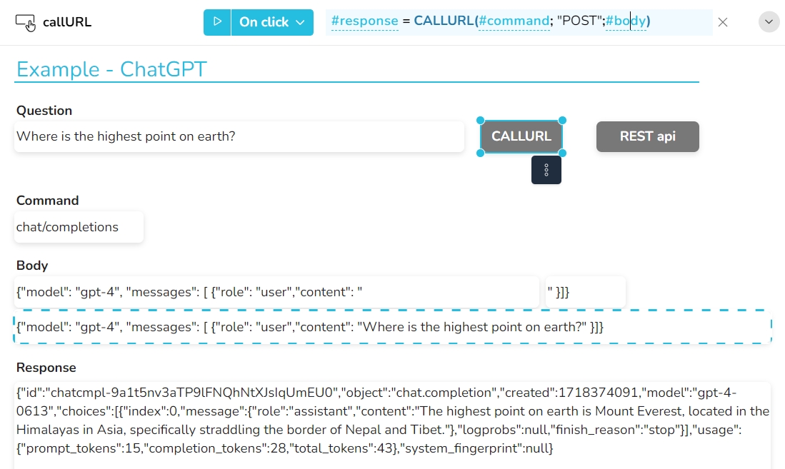 The "CALLURL" button uses the "REST api" button as a reference in the connection formula. When a request is sent with the CALLURL function, the authentication of the connection is used, in this case a bearer token (which is required by ChatGPT).
