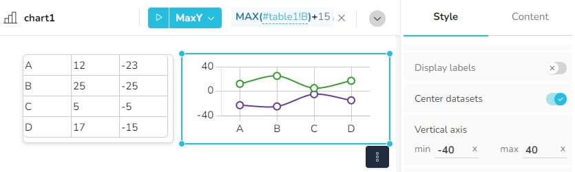 The MinY and MaxY properties are defined by numeric values. The calculation of these values replace any value which is previously entered in the Style tab of the chart widget.