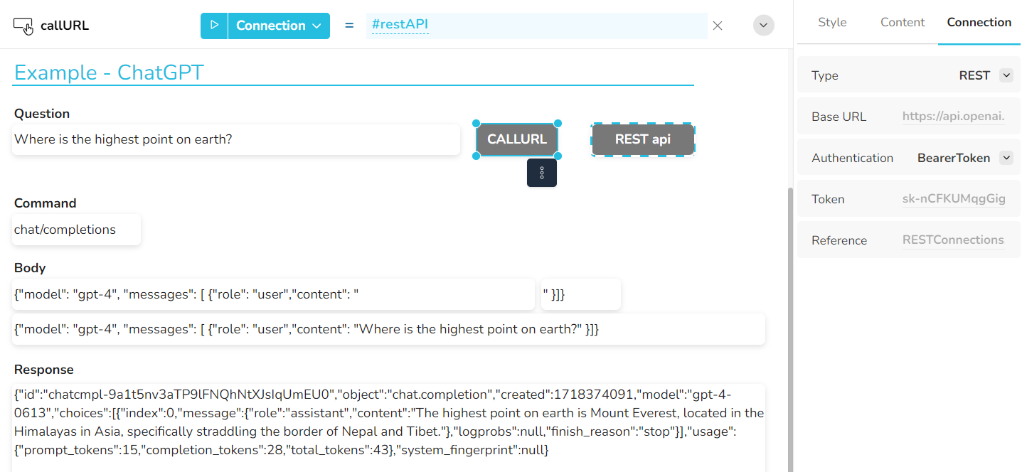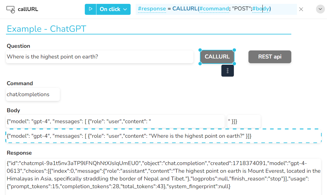 The "CALLURL" button uses the "REST api" button as a reference in the connection formula. When a request is sent with the CALLURL function, the authentication of the connection is used, in this case a bearer token (which is required by ChatGPT).