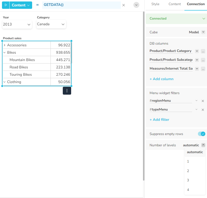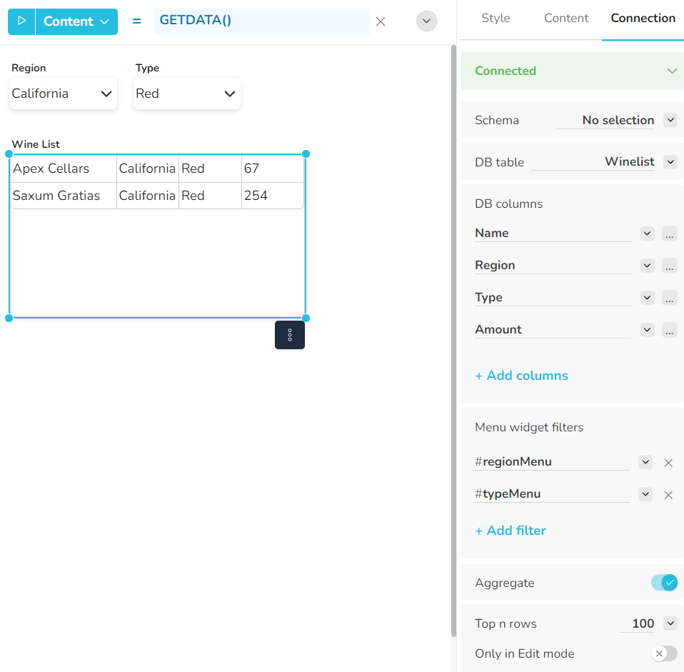 Im Menü DB Table / Cube können Sie die Datenbanktabelle, die View oder den Cube auswählen, dessen Inhalt im Widget angezeigt werden soll. Um den Inhalt abzurufen, verwenden Sie die Funktion GETDATA() ohne Parameter in der Formel Inhalt.