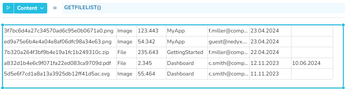 The function returns a range containing all files which have been uploaded or created in the current nedyx workspace, with the following columns:
