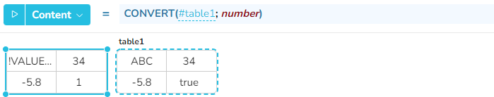 The left table contains the values of table1, converted to numbers. If a value cannot be converted to a number, !VALUETYPE is displayed. A boolean is converted to its number representative.