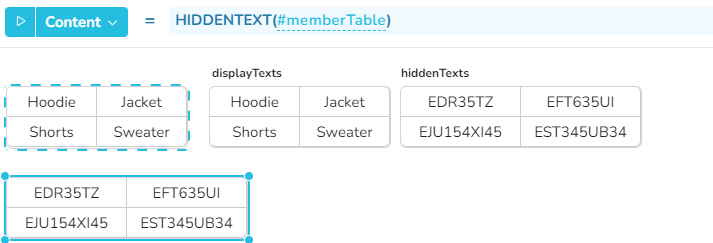 In this example, the memberTable has been created by the function CREATEMEMBER, based on the tables displayTexts and hiddenTexts. Then the function HIDDENTEXT can be used later to extract the hidden texts from memberTable.