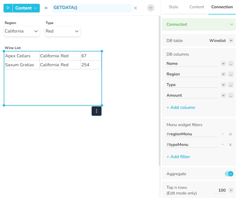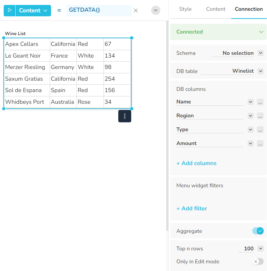 In the DB table menu you can select the database table, view or cube whose content should be displayed in the widget. To retrieve the content, use the function GETDATA() with no parameter in the Content formula.