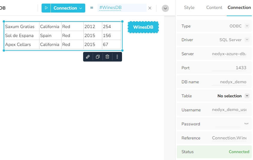Die Tabelle verwendet die Verbindung, die in der Schaltfläche WinesDB definiert ist. Nur das Tabellenmenü ist auf der Registerkarte Connection verfügbar, alle anderen Parameter können nur im Widget der Schaltfläche WinesDB geändert werden.