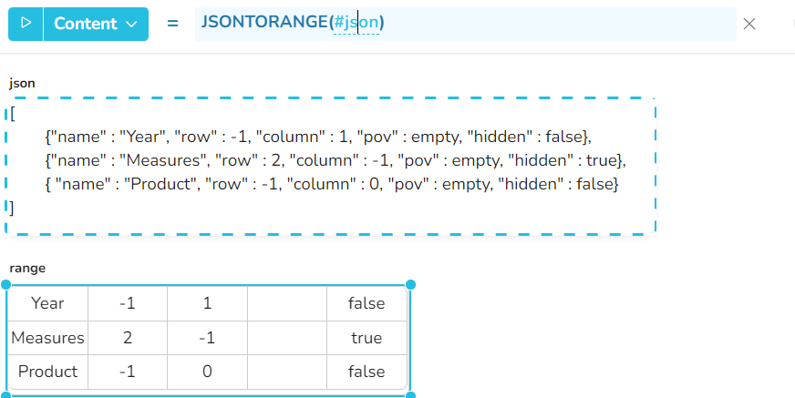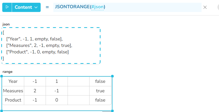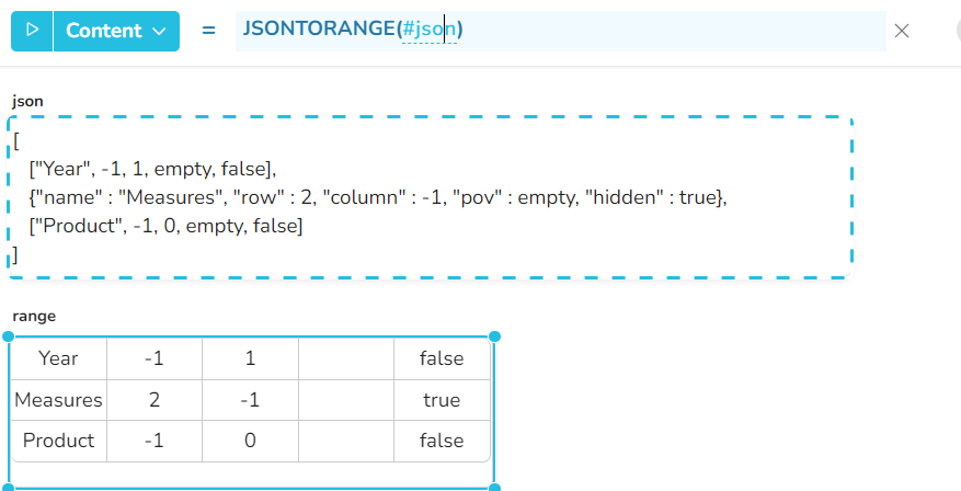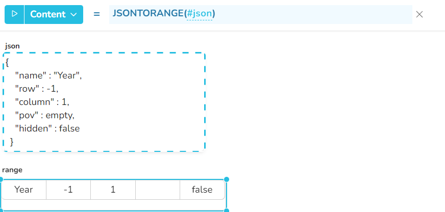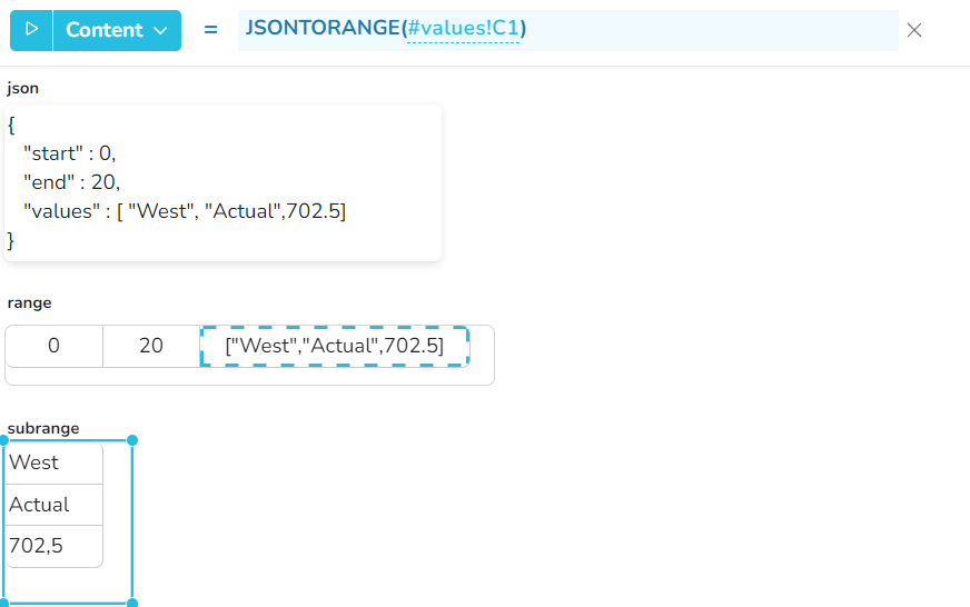 Beispiel 7 - Wenn die json-Datei eine Struktur mit mehr als 2 Ebenen enthält, ist es möglich, den Inhalt der untergeordneten Werte durch nachfolgende Aufrufe der Funktion JSONTORANGE zu extrahieren.