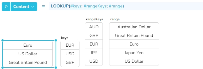 LOOKUP(keyColumn; rangeKeys; range; orientation)