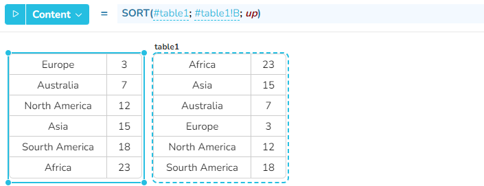 In diesem Beispiel gibt die Funktion SORT den Inhalt von table1 zurück, aufsteigend sortiert nach den Werten in der zweiten Spalte: