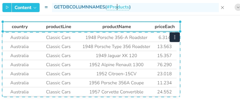 Die Funktion gibt einen Bereich von Zeilen zurück, der die DB-Spaltennamen enthält, mit demselben Text, der in der DB-Spaltenliste auf dem Connection-Tab angezeigt wird.