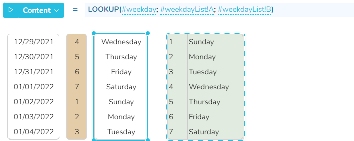 Mit der Funktion LOOKUP können Sie die Namen der Wochentage mit Hilfe einer Umrechnungstabelle (grün eingefärbt) abrufen.