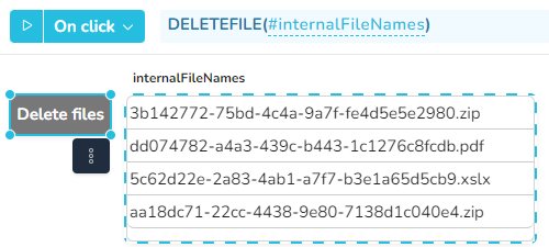 Hier löscht das Schaltfeld "Delete file" die Datei mit dem internen Dateinamen aus dem Feld internalFileName vom nedyx Server: