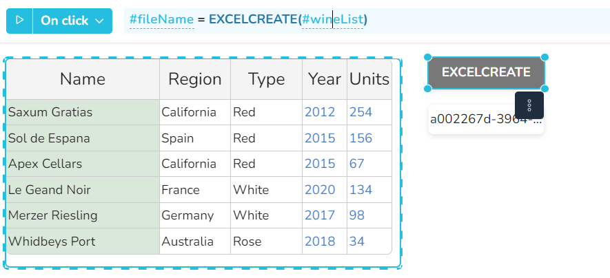 Hier wird mit der Funktion EXCELCREATE eine Excel-Datei mit dem Inhalt des wineList-Widgets auf dem nedyx-Server gespeichert, wobei der interne Dateiname im Zellen-Widget hinterlegt ist. Die erstellte Datei kann anschließend mit den Funktionen DOWNLOADFILE oder SENDEMAIL weiterverarbeitet werden.