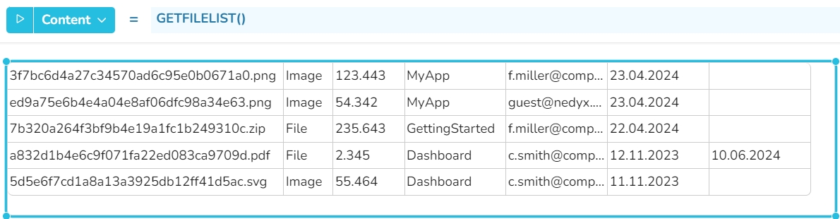 Um dies zu ermöglichen, werden die Dateinamen nur im Hash-Format zurückgegeben. Es ist also möglich, die Dateien zu löschen (mit der Funktion DELETEFILE), diese können aber nicht heruntergeladen oder versendet werden.