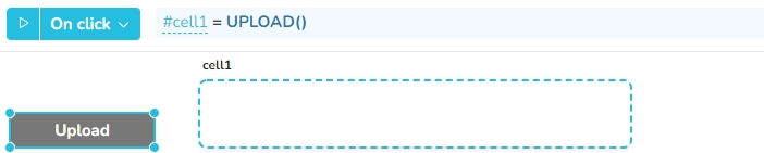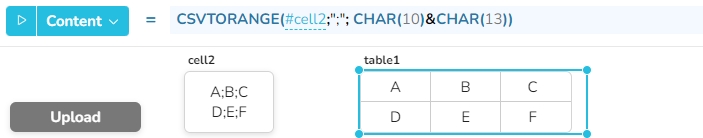 In Kombination mit CSVTORANGE kann die Funktion UPLOAD verwendet werden, um den Inhalt eines Tabellen-Widgets mit dem Inhalt einer csv-Datei auf dem Client-Rechner zu füllen. Die Formel des "Upload"-Buttons ist hier analog zum vorherigen Beispiel: #cell2 = UPLOAD()