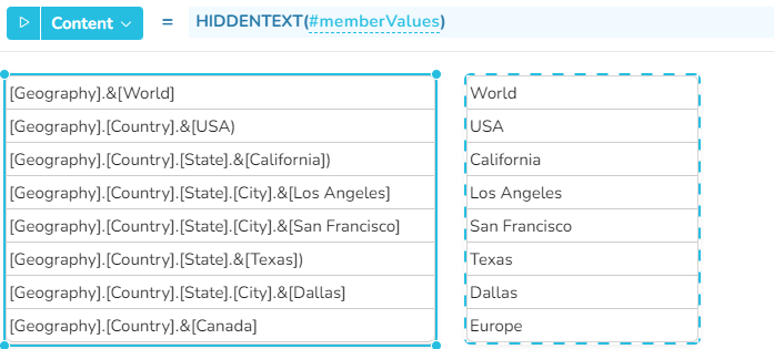 In diesem Beispiel gibt die Funktion HIDDENTEXT die eindeutigen Texte von Dimensionselementen zurück, die von Analysis Services stammen.
