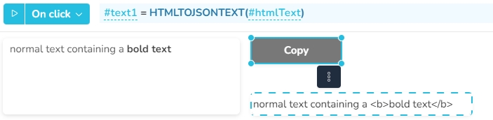 In diesem Beispiel wandelt ein Klick auf die Schaltfläche Copy den html-Text aus dem gestrichelten Widget in einen json-Text um, indem die Funktion HTMLTOJSONTEXT verwendet wird. Das Ergebnis wird dann dem Textwidget auf der linken Seite zugewiesen, wo es als formatierter Text angezeigt wird.