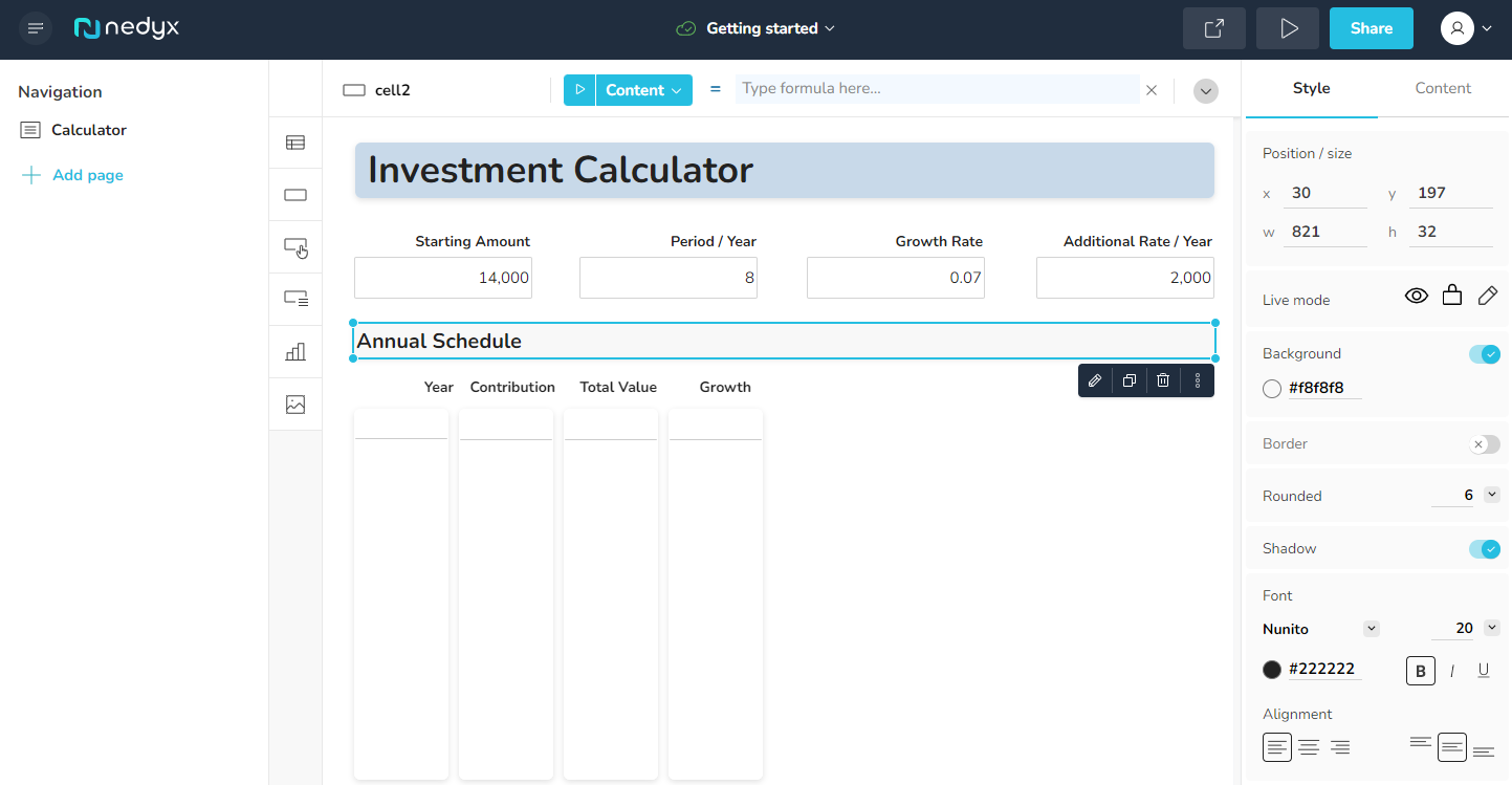Klicken Sie auf das Zellen-Widget mit dem Inhalt Annual Schedule. Dadurch werden alle verfügbaren Formate für diesen Widget-Typ auf dem Style-Tab auf der rechten Seite geöffnet.