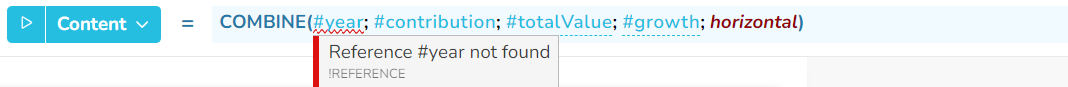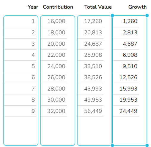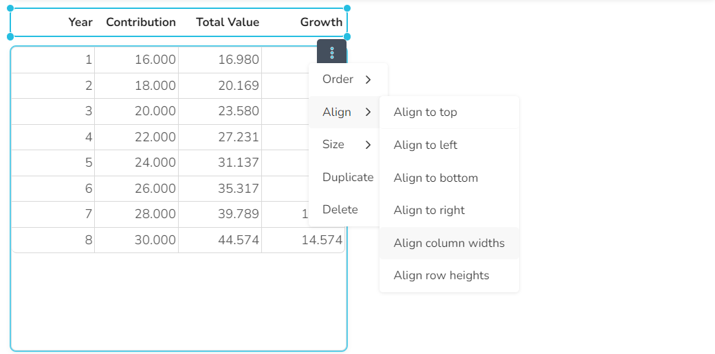 COMBINE(#Page1.year; #Page1.contribution; #Page1.totalValue; #Page1.growth; horizontal)