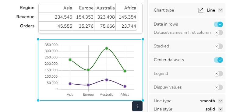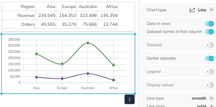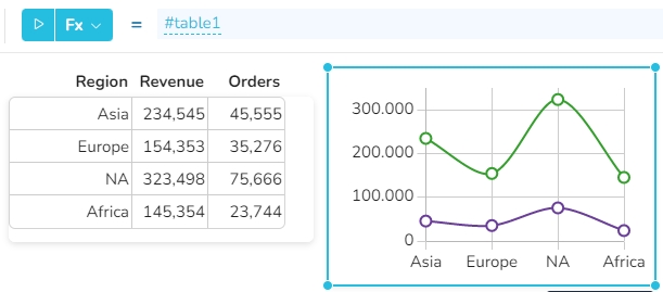 In diesem Beispiel bezieht das Diagramm seinen Inhalt direkt aus einem Tabellen-Widget. Der Inhalt kann aber auch mit einer beliebigen Formel definiert werden, die einen Datenbereich zurückgibt.